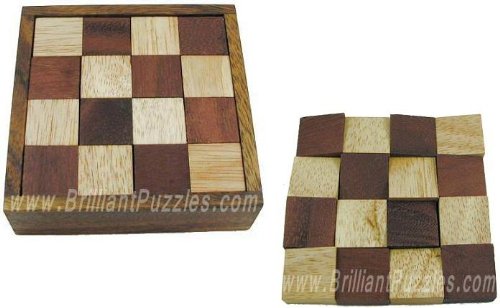 This one of a kind sixteen pieces wooden brain teaser puzzle represent all the possible ways that two pieces of 2 colors cut in different angels can be joined. The objective is to assemble the pieces into a two-layer, 5x5 checkerboards with the colors matching on both layers and with the colors being different on both layers. Tjis puzzle won the 1990 Hikimi puzzle competition in Japan and considers one of the most difficult puzzles in our collection. Read more...