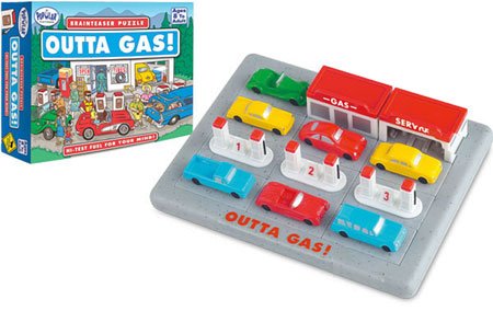 Outta Gas! is an entirely new type of slide puzzle. It's three-dimensional, has incredible detail, and features a special flip-up building that covers the traditional open space. The end result is a complete miniature gas station with vintage cars, gas pumps, office, and a service bay with a floor lift, workbenches, and oil drums inside. After you've arranged the cars and pumps to solve the twelve challenges on the back of the puzzle, you can make up your own and challenge your family and friends! Read more...
