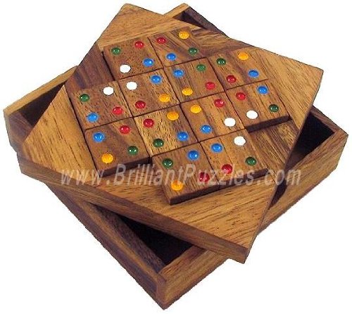 This Wooden brain teaser game contains 12 wooden tiles each marked with four colored dots at the corners. Each tile has the same 4 colors but in different combinations. Try to match all the wooden tiles back in the wooden frame. You will find out it is not an easy task. Comes with a game board and a matching lid. Read more...
