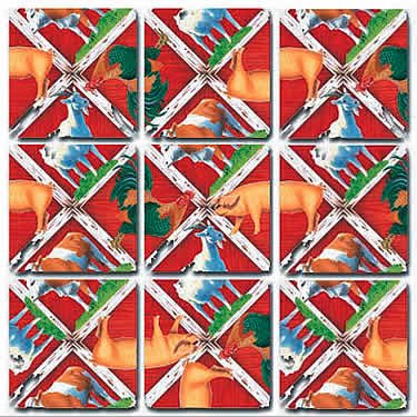 Moo! Oink, oink! Take a trip to the barnyard in this version of the Scramble Squares challenge. Easy to Play, but Hard to Solve is the motto for this deceptively simple-looking puzzle. By the time you've become addicted and find yourself unable to solve the thing, you'll realize it's not so much a motto as a warning. Nine colorfully illustrated cardboard 4-by-4-inch squares depict various unfinished images of goats, pigs, cows, and roosters along their edges. The images must be matched and the nine squares arranged in a larger square. An ingenious, elegantly executed puzzle idea, Scramble Squares will have you simultaneously blessing and cursing its inventor. --Claire Dederer