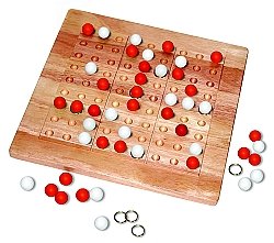 If you love to play the Colorku Game, then you will love the new Tic-Tac-Ku Game from Mad Cave Bird Games! A new adaptation of the classic tic-tac-toe game, Tic-Tac-Ku Game is the durable wooden game that is full of strategy that really makes you use your marbles in every sense! The Tic-Tac-Ku Game is played on a 9-3x3 square board, where the play of one player dictates where the next player must place his or her marble. So in the Tic-Tac-Ku Game, if the first player places a marble in the center spot of one of the 9 squares, the other player must place their marble in a center spot in another playing square. While this game play might sound easy, the Tic-Tac-Ku Game involves a lot of skill and strategy in order to win. The first player to win 5 or the majority of the squares is the winner! So, if you thought tic-tac-toe was an easy game, then the Tic-Tac-Ku Game from Mad Cave Bird Games is about to change your perception! Includes a wooden playing board that measures 13.5 x13.5 and 81 blue and white marbles. For 2-4 players. Read more...