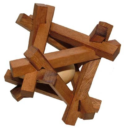 AJ is one of the larger wooden Brain Teaser puzzles that we offer. Originally designed by Philippe Dubois.12 Pieces puzzle creating a cage that contains a wooden ball wooden ball. The twelve sticks form an octahedron shape in an extra large version. The AJ is a LARGE 5 inch interlocking burr and can displays very nicely as a desk accessory or coffee table puzzle. The challenge is to disassemble the 12 pieces to remove the ball from the structure. Then try to put it all back together again. Good luck.. Read more...