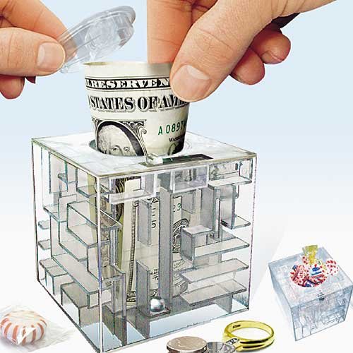 A Money Maze Puzzle Bank provides a fun and even challenging way to give a gift of money, a gift card, candy, or any small gift! Put a prize in the Money Maze for your friends, family, or coworkers... but the trick is to see if they can figure out the maze to get to it. They'll have to earn that gift of cash, gift cards or tickets by solving a puzzle. This intriguing clear plastic Money Maze Puzzle has inner compartment that can only be accessed by guiding the metal ball through the maze, which unlocks a trap door. Measures 3 1/2in. square. Read more...